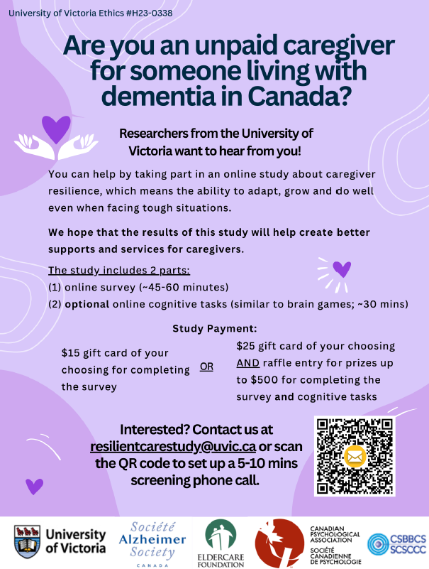 To sign up, scan the QR code on the flyer below or email resilientcarestudy@uvic.ca by August 2026, and the research team will contact you. You will be compensated for your participation.